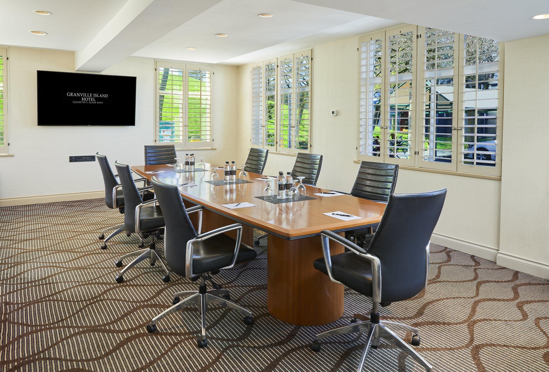 Located on the ground level, this 500-square-foot conference room is a perfect fit for small business meetings in Vancouver. Featuring wireless or wired internet, a grand oak boardroom table that seats up to 12 people with ergonomically correct leather chairs. We ensure your comfort attending long business meetings in this room. Looking for natural light? This room features two walls of windows with adjustable wooden shutters.